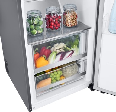 Køleskabet tilbyder en volumen på 386 liter, så der er rigeligt med plads til ugens indkøb. Enheden har 5 glashylder, 2 rummelige skuffer og flere dørrum.
