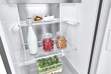 Køleskabet tilbyder en volumen på 386 liter, så der er rigeligt med plads til ugens indkøb. Enheden har 5 glashylder, 2 rummelige skuffer og flere dørrum.