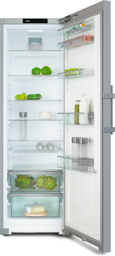 Høje beholdere kan ofte kun opbevares i køleskabsdøren. Takket være den delbare glashylde, Miele FlexiBoard, kan høje beholdere nu også opbevares andre steder end i køleskabsdøren. Du skal bare skubbe den forreste del af FlexiBoard ind under den bagerste. Sådan får du plads i det forreste område til høje flasker eller mælkekartoner. Den bagerste del er også velegnet som opbevaringsplads. På den måde kan du udnytte pladsen optimalt.