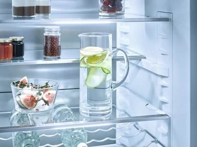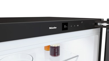 Høje beholdere kan ofte kun opbevares i køleskabsdøren. Takket være den delbare glashylde, Miele FlexiBoard, kan høje beholdere nu også opbevares andre steder end i køleskabsdøren. Du skal bare skubbe den forreste del af FlexiBoard ind under den bagerste. Sådan får du plads i det forreste område til høje flasker eller mælkekartoner. Den bagerste del er også velegnet som opbevaringsplads. På den måde kan du udnytte pladsen optimalt.