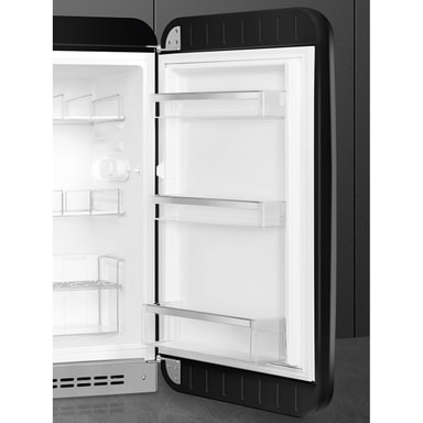 Smeg køleskab FAB10HRBL6 i sort tilbyder 135 liters kapacitet med et retro 1950'er design, ultra-støjsvagt med kun 35 dB, udstyret med to justerbare hylder, LED-belysning og højrehængslet dør, perfekt til kompakte rum.Læs mere om produktet