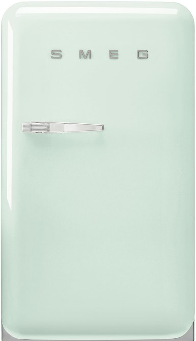 Smeg køleskab FAB10HRPG6 i pastellgrøn, med en kapacitet på 135 liter, pralende med et retro 1950'er design, støjsvag drift på 35 dB, to justerbare hylder, LED-belysning og en højrehængslet dør, perfekt til kompakte rum.Læs mere om produktet