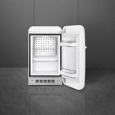 Smeg Køleskab FAB5RWH6 i elegant hvid har en kompakt højde på 72,5 cm og bredde på 40,4 cm, med 2 hylder, justerbare fødder og en støjsvag drift på 36 dB, perfekt til stilfuld køling, der sparer plads.Læs mere om produktet