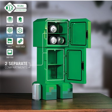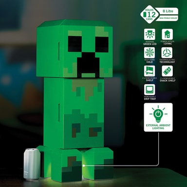 Ukonic Minecraft Figural Creeper mini-køleskabet 870401 kan rumme op til 12 sodavandsdåser og bruger termoelektrisk teknologi. Det har to rum, så du kan opbevare drikkevarer eller snacks. Dette kompakte minikøleskab er din ideelle gamingpartner.Læs mere om produktet