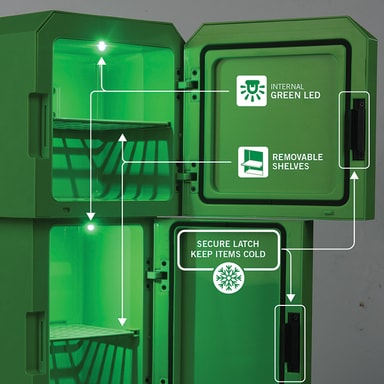 Ukonic Minecraft Figural Creeper mini-køleskabet 870401 er officielt licenseret merchandise. Mini-køleskabet er et funktionel køleskab med et sjovt, karakterinspireret design. Det kan rumme op til 12 standard sodavandsdåser og har desuden et separat rum til snacks. Praktisk, stilfuldt og fuld af personlighed.