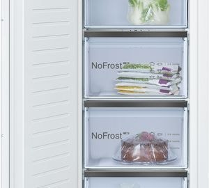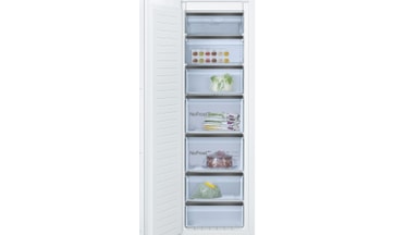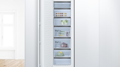 Den indbyggede Bosch fryser GIN81HCE0 lader dig opbevare alle dine frosne dagligvarer under optimale forhold og VarioZone og skuffer med transparente fronter hjælper dig med at holde din fryser organiseret. Derudover sørger den skarpe LED-belysning, døralarmen og HomeConnect-appen for en god brugeroplevelse.