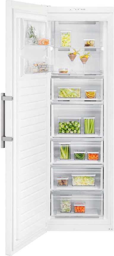 Få fleksible opbevaringsløsninger til din fryser med OpenSpace designet, der har glashylder, som nemt kan tages ud for at opbevare store ting. Fryserens øverste del har åbne hylder, så der er ikke skjules noget i skufferne.