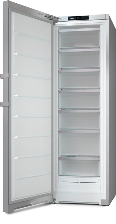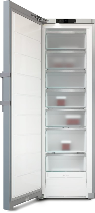 Miele fryseren kommer i et skønt ståldesign, som passer ind i ethvert køkken. Døren har et eksternt håndtag. Der er masser af plads til alle dine madvarer.