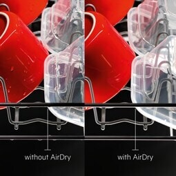 AirDry afslutter tørreprocessen med naturlig luftcirkulation. Lågen åbnes automatisk mod slutningen af programmet, så rumtempereret luft kan strømme ind i opvaskemaskinen. Op til 3 gange bedre tørring sammenlignet med systemer med lukket låge.
