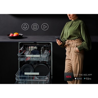 QuickSelect med WiFi sender meddelelser om vedligeholdelse og tydelige trin-for-trin vejledninger direkte til din smartphone via My AEG Kitchen App, så du kan køre programmet Machine Care, som hjælper din opvaskemaskine til at fungere optimalt.