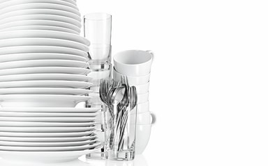 Vario-kurvsystemet med højdejusterbar overkurv og foldbare stativer rummer tallerkener i forskellige størrelser. En bestikbakke og -kurv giver rigelig plads til redskaber.