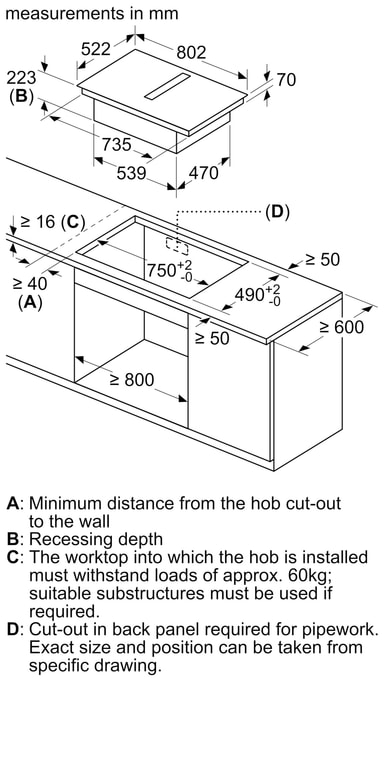 • - Det er ikke nødvendigt med en plade under kogepladen. Skufferne og/eller hylderne i underskabet skal kunne tages ud. Underskabets bagpanel kan beholdes - der er kun brug for en udskæring til luftudløbet (placering og størrelse angives i installationsvejledningen).
