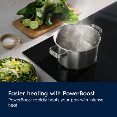 Aktivér PowerBoost-funktionen for øjeblikkelig varme under tilberedning. Den er ideel til at få retterne klar hurtigere. Du kan koge vand hurtigere end nogensinde før og få panderne klar til stegning, når du har brug for dem.