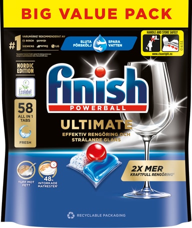 Sig farvel til det hårde snavs på dine tallerkener med Finish Ultimate all in 1 opvaskemiddeltabletter 58T. Denne 2x kraftige vasketablet beskytter glasvarer mod korrosion. Den er indkapslet i en 100 % vandopløselig film, er miljøvenlig og bruger 15 % mindre kemikalier, hvilket sikrer en førsteklasses rengøringsydelse.