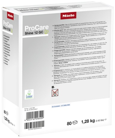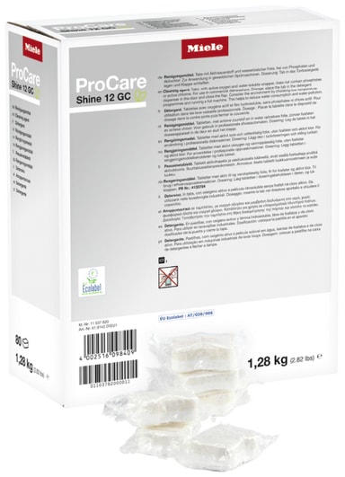 Miele ProCareShine opvasketabletterne MIELE11037820 er ideelle til hoteller, pubber og caféer. De 80 stk. tabletter med aktiv ilt er fri for fosfater og klor og kommer i en vandopløselig indpakning. Passer til alle Profi- og MasterLine-opvaskemaskiner.