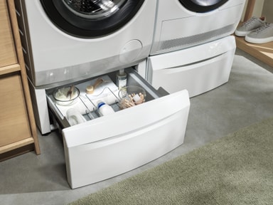 Rygvenlig piedestal hæver din vaskemaskine med så meget som 30 cm for nemmere adgang, når du ilægger og tager tøjet ud.