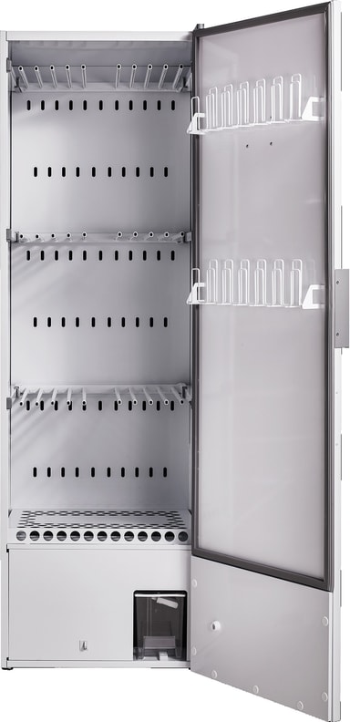 Denne enhed skiller sig ud ved at passe godt på materialer som uld, silke, plastik eller læder uden at skade tøjet på nogen måde. Tørreskabet kan også tørre sko, handsker og flyverdragter.