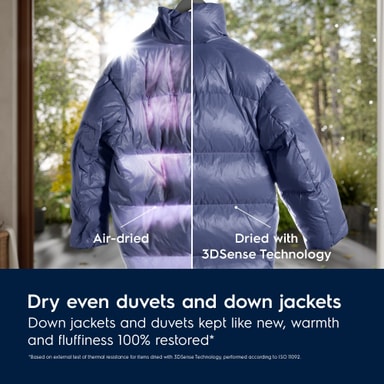 3DSense teknologi, vores unikke teknologi, scanner tøjets fugtighed for at opnå nøjagtig og komplet tørring. Selv det tykkeste tøj, som dyner og dunjakker, tørres på en ensartet måde og beskyttes, så det bliver ved med at være blødt og holder på varmen.