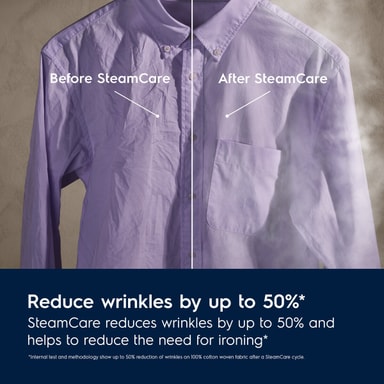 SteamCare funktionen hjælper med at neutralisere lugte og reducere folder i tøjet med op til 50%. Færre folder i dit tøj giver mindre behov for strygning, så tøjet holder længere. *Intern test og metode viser op til 50% færre folder i 100% vævet stof efter et SteamCare program.