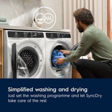 SmartSelect er din intuitive alt-i-én-løsning til vasketøjet. Det giver dig mulighed for hurtigt at vælge den ønskede tørhed, mens symbolet med det grønne blad giver feedback om energiforbruget. Med en tilsluttet Electrolux vaskemaskine og tørretumbler giver SyncDry dig mulighed for at parre din tørretumblerindstilling med dit tidligere vaskeprogram for nem brug. Du kan endda fjernbetjene tørretumbleren via funktionen Fjernbetjent start og foretage justeringer, mens du ikke er hjemme.