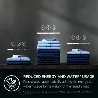 PreciseWash justerer automatisk energiforbruget ud fra vasketøjets vægt. Du får skræddersyede vaskeprogrammer, der reducerer vand- og energiforbrug samt tid med op til 40% ved mindre tøjmængder. * *Intern test af tids-, vand- og energiforbrug ved en bomuldscyklus på 30°C, som var optimeret med PreciseWash til 1 kg vasketøj i forhold til maksimal mængde.