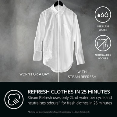 Steam Refresh neutraliserer lugt* og gør dit tøj mindre krøllet på kun 25 minutter - selv sarte tekstiler. Og ønsker du en ekstra frisk følelse, kan du tilføje en aromatisk dampduft. *Intern test viser neutralisering af cigaretlugt ved brug af Steam Refresh programmet