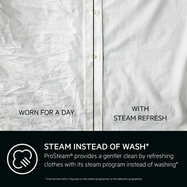 Damp i stedet for vask er en hurtig og skånsom måde til at friske tøj op, som ikke behøver en fuld vask. 7000 ProSteam® vaskemaskinen har en dampfunktion til at friske tøj op, der kun bruger 2 liter vand pr. vask. *Intern test med 1 kg fyldning på dampprogram vs. skåneprogram.
