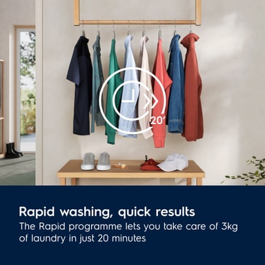 Hurtigprogrammet vasker tøjet let og hurtigt. Vask 3 kg vasketøj på kun 20 minutter.