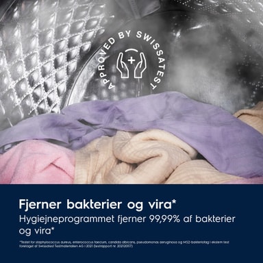 Hygiejneprogrammet, der er certificeret af Swissatest, kombinerer et vaskeprogram og damp og fjerner mere end 99,99% bakterier og vira* ved en vasketemperatur over 60°C. Pollen og allergener reduceres også og giver hygiejnisk rent tøj efter hver vask. *Testet for Staphylococcus aureus, Enterococcus faecium, Candida albicans, Pseudomonas aeruginosa og bakteriofag MS2 i ekstern test udført af Swissatest Testmaterialien AG i 2021 (testrapport nr. 202120117)