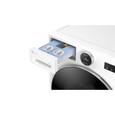 Denne LG vaskemaskine har en tromlekapacitet på 11 kg, hvilket gør det muligt at vaske store mængder tøj i én vask.