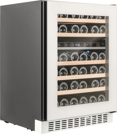 Dette vinskab har en hvid glasfinish og et integreret håndtag, hvilket gør det til en god tilføjelse til ethvert moderne køkken.