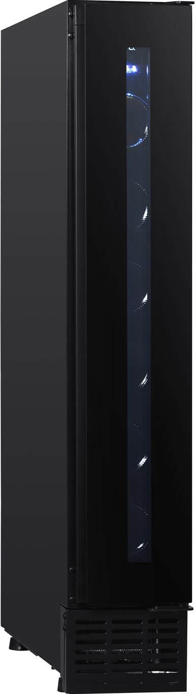 Dette vinskab har en sort glasfront og et integreret håndtag, hvilket gør det til en fantastisk tilføjelse til ethvert moderne køkken.