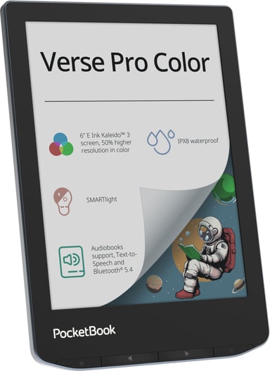 PocketBook Verse Pro Color e-bogslæseren er designet til at løfte dine læse- og lytteoplevelser med dens avancerede funktioner. Denne enhed er udstyret med en 6-tommer E Ink Kaleido 3 farveskærm, der tilbyder et levende og øjenvenligt display, der er velegnet til både tekst og grafisk indhold. Dens robuste IPX8-vandtæthed giver dig mulighed for at nyde dine yndlingsbøger ved poolen eller i badet uden bekymring. E-læseren understøtter en bred vifte af lydformater og inkluderer en tekst-til-tale-funktion, hvilket gør den ideel for lydbogsentusiaster. Drevet af en Quad Core-processor sikrer PocketBook Verse Pro Color problemfri ydeevne, alt sammen i et elegant og kompakt design.