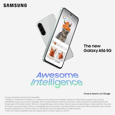 Samsung Galaxy A56 med teksten: "Awesome Intelligence"