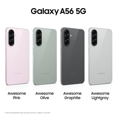 Samsung Galaxy A56 i forskellige vinkler og i farverne: Awesome Graphite, Awesome LightGray, Awesome Olive, and Awesome PinkSamsung Galaxy A56 i forskellige vinkler og i farverne: Awesome Graphite, Awesome LightGray, Awesome Olive, and Awesome Pink