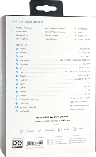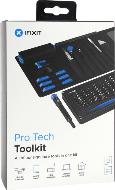 Har du en løs forbindelse? Et dødt batteri? Eller måske et ødelagt stik? Mange af de problemer, vi har med forskellige elektronikenheder kunne let repareres med en smule snilde – hvis det ikke var for alle de mange skruer med specielle skruehoveder, som holder dem sammen. Velkommen til iFixit Pro Tech-sættet! Det indeholder Mako 64-bit driver-sættet med de mest almindelige industristandardbits samt mange bits til ikke-standard, mærkespecifikke skruer. Og med den inkluderede skruetrækker er det en smal sag at adskille og samle en lang række af mindre elektronikenheder såsom mobiltelefoner, tablets, bærbare computere, joysticks til konsoller, og meget mere. Sættet indeholder også 13 praktiske redskaber til at adskille enheder, justere små skruer eller forsigtigt fjerne skærme fra elektronikenheder.