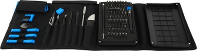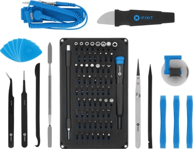 Værktøjer: Værktøjssættet inkluderer også en vinklet præcisionspincet, 1 spudger-værktøj, 1 skæreværktøj med et skarpt knivsblad til at åbne og adskille elektronikenheder, 3 iFixit universalværktøj til at åbne enheder, 1 sugekop til at justere skærme, 1 armbånd til at aflede statisk elektricitet samt 6 iFixit åbneværktøjer.