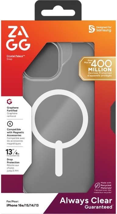 Zagg Crystal Palace Apple iPhone 16E/17E/15/14/13 coveret giver stilfuld beskyttelse med ridsefast finish, 4m faldsbeskyttelse og anti-gulnende teknologier, der sikrer et elegant look og ultimativ holdbarhed.
