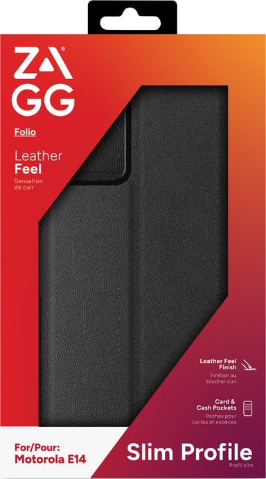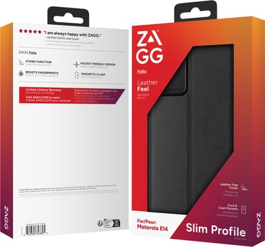 Zagg Motorola E14 pungetuite er et pålideligt etui, der holder din telefon beskyttet i enhver hverdagssituation. Dette slanke, elegante pungetui er lavet af PU-læder og inkluderer kortpladser og et praktisk indbygget stativ.Læs mere om produktet