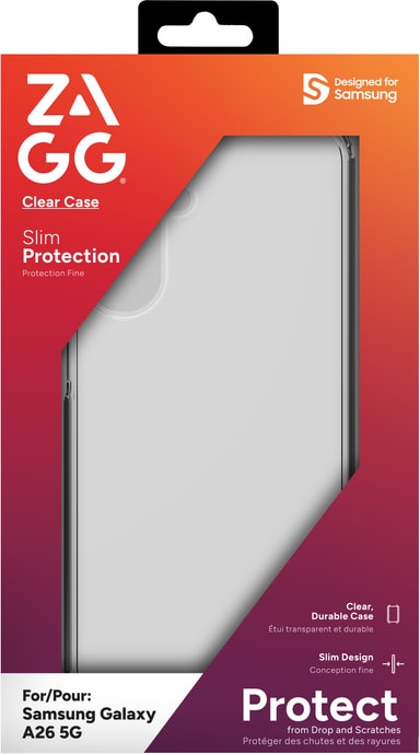 Zagg Samsung Galaxy A26 gennemsigtig etuiet beskytter din telefon, mens den bevarer et moderne udseende. Det giver beskyttelse mod fald og understøtter trådløs opladning.Læs mere om produktet