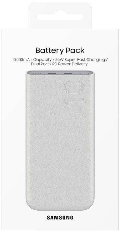 Samsung batteripakken 10.000 mAh gør dit liv en smule mere behageligt ved at fjerne stress ved lavt strømforbrug på elektronik som telefoner og meget mere. Uanset om du er på farten eller sidder stille, gør dens enkle og komfortable design den nem at tage med dig, så du kan oplade dit udstyr når som helst og hvor som helst. Med to USB-C-porte kan du oplade to ting på samme tid, så du ikke behøver at prioritere. En kapacitet på 10.000 mAh og en opladningseffekt på 25 W gør den til en trofast følgesvend, uanset hvor du går hen.