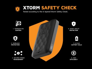 For at beskytte dine enheder mod kortslutning, overophedning og overopladning kommer powerbanken med en indbygget 6-lags sikkerhedskontrol.
