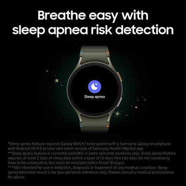 Hav altid ro i sindet med en hjerteovervågningspakke. Den indbyggedePPG-sensor på dit Samsung Galaxy Watch7 overvåger din puls og hjerterytme. Hvis den opdager uregelmæssigheder i din puls eller hjerterytme, giver den dig besked sammen med en opfordring til at tage et EKG for at undersøge din hjerterytme nærmere.
