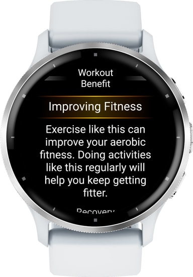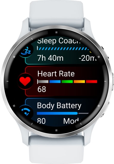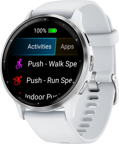 Smartwatchet kan spore løb, cykling, løbebånd, crosstraining, cardio, yoga og andre aktiviteter. Det er også svømmesikkert og kan prale af 5ATM vandmodstand, så du kan stadig bære det i en pool eller bruser. Kropsbatterimonitorerne giver dig mulighed for at se din krops energiniveauer, så du ved, hvornår du er klar til aktivitet. Venu 3 har også en kørestolstilstand, push-registrering og tilbyder forudindlæste træningprogrammer, der er specifikttil kørestolsbrugere.Du kan få personlige træningsplaner med den gratis Garmin Coach smart app.