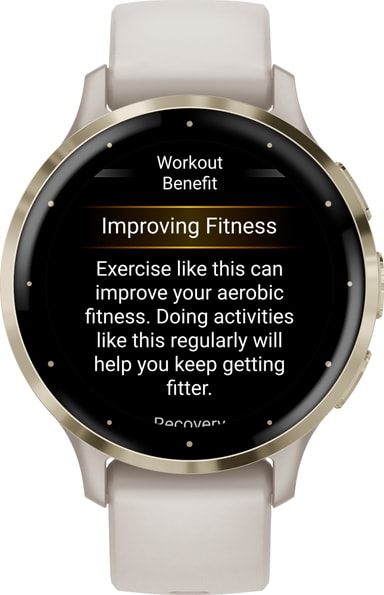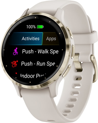 Smartwatchet kan spore løb, cykling, løbebånd, crosstraining, cardio, yoga og andre aktiviteter. Det er også svømmesikkert og kan prale af 5ATM vandmodstand, så du kan stadig bære det i en pool eller bruser. Kropsbatterimonitorerne giver dig mulighed for at se din krops energiniveauer, så du ved, hvornår du er klar til aktivitet. Venu 3S har også en kørestolstilstand, push-registrering og tilbyder forudindlæste træningprogrammer, der er specifikttil kørestolsbrugere.Du kan få personlige træningsplaner med den gratis Garmin Coach smart app.
