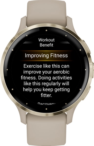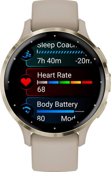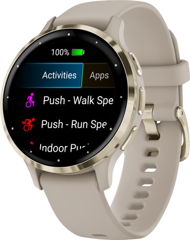 Smartwatchet kan spore løb, cykling, løbebånd, crosstraining, cardio, yoga og andre aktiviteter. Det er også svømmesikkert og kan prale af 5ATM vandmodstand, så du kan stadig bære det i en pool eller bruser. Kropsbatterimonitorerne giver dig mulighed for at se din krops energiniveauer, så du ved, hvornår du er klar til aktivitet. Venu 3S har også en kørestolstilstand, push-registrering og tilbyder forudindlæste træningprogrammer, der er specifikttil kørestolsbrugere.Du kan få personlige træningsplaner med den gratis Garmin Coach smart app.
