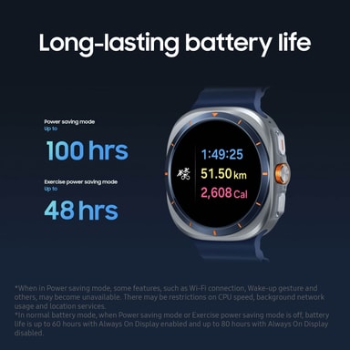 Galaxy Watch Ultra er bygget til at flytte grænser og tåler op til 55°C varme, 9.000 meters højde,10 ATM vandtryk og kører problemfrit gennem det hele med en ny, kraftfuld 3nm-processor. Gør turen længere med et batteri, der holder i op til 100 timer i strømbesparende tilstand. Den nye BioActive Sensor følger dig tæt, og Galaxy AI giver dig indsigt og hjælper dig med at flytte dine grænser.