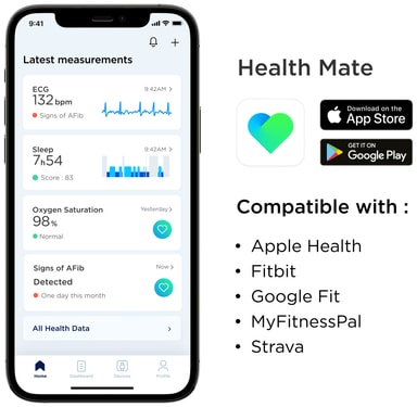 Forbind din smartphone til ScanWatch via Bluetooth og modtag notifikationer om opkald, beskeder, begivenheder og apps direkte på dit håndled. Download Health Mate-appen til din smartphone og se alle dine data og få indsigt samt ekstra motivation med mærker og programmer. Smart-appen er gratis og fungerer med Android 8 eller nyere og iOS 12 eller nyere.