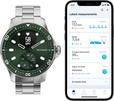 ScanWatch Horizon er udviklet i samarbejde med kardiologer for at tilbyde avanceret medicinsk teknologi. Det måler løbende udsving i puls og sender en notifikation, når det registrerer uregelmæssig pulsslag. Det har et pålideligt elektrokardiogram (ECG). Dets resultater kan ses på smartwatchets skærm og i smart-appen. Her kan du finde endnu mere dybdegående diagnostik med mulige tegn på atrieflimren, og det giver yderligere råd. Takket være det indbyggede oxymeter kan du få måling af iltmætningsniveau (Sp02) på 30 sekunder og registrere forstyrrelser i vejrtrækningen.