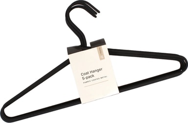 A Home bøjlerne har en minimalistisk, lige metalramme belagt med stof, der giver et stilrent og ensartet udtryk. Den neutrale sorte finish passer let ind i enhver garderobe og kombinerer både funktion og diskret stil.
